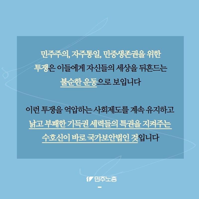 국가보안법은 70여년이 넘는 시간동안 사람들의 사상과 생각의 자유를 억압하고 정부에게 옳은 소리 하는 노동자민중들을 억압해 왔습니다.