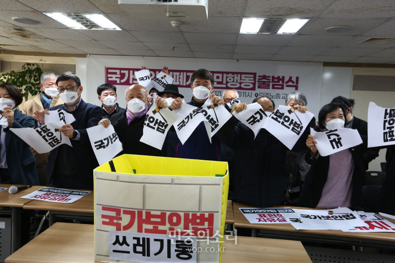 국가보안법폐지 국민행동 출범식에서 참석자들이 국가보안법 폐지 상징의식을 하는 모습. 2021.03.04ⓒ김철수 기자