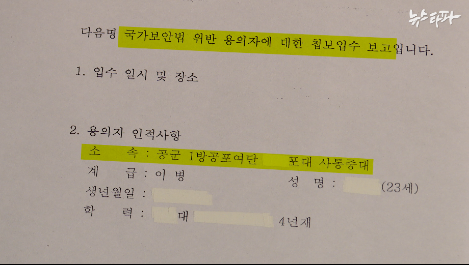 쌔미(활동명) 씨가 올해 3월 군사안보지원사령부로부터 부분 공개 받은 본인에 대한 첩보입수 보고 문건.